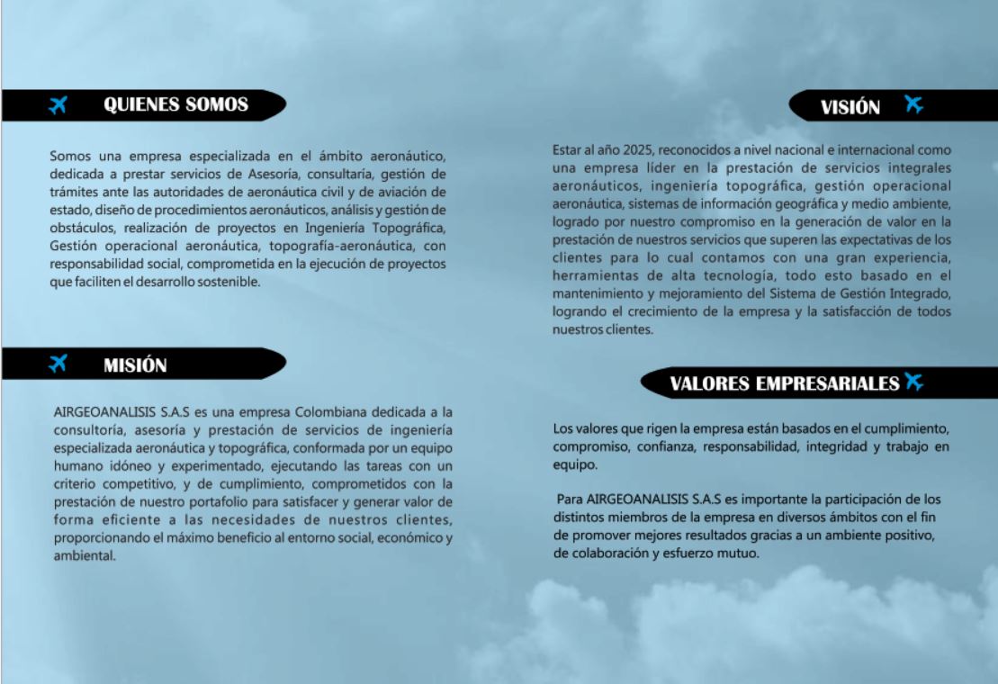 AIRGEOANALISIS S.A.S es una empresa Colombiana dedicada a la consultoría, asesoría y prestación de servicios de ingeniería especializada aeronáutica y topográfica, ejecutando las tareas con un criterio competitivo, y de cumplimiento, comprometidos con la prestación de nuestro portafolio para satisfacer y generar valor de forma eficiente a las necesidades de nuestros clientes, proporcionando el máximo beneficio al entorno social, económico y ambiental.