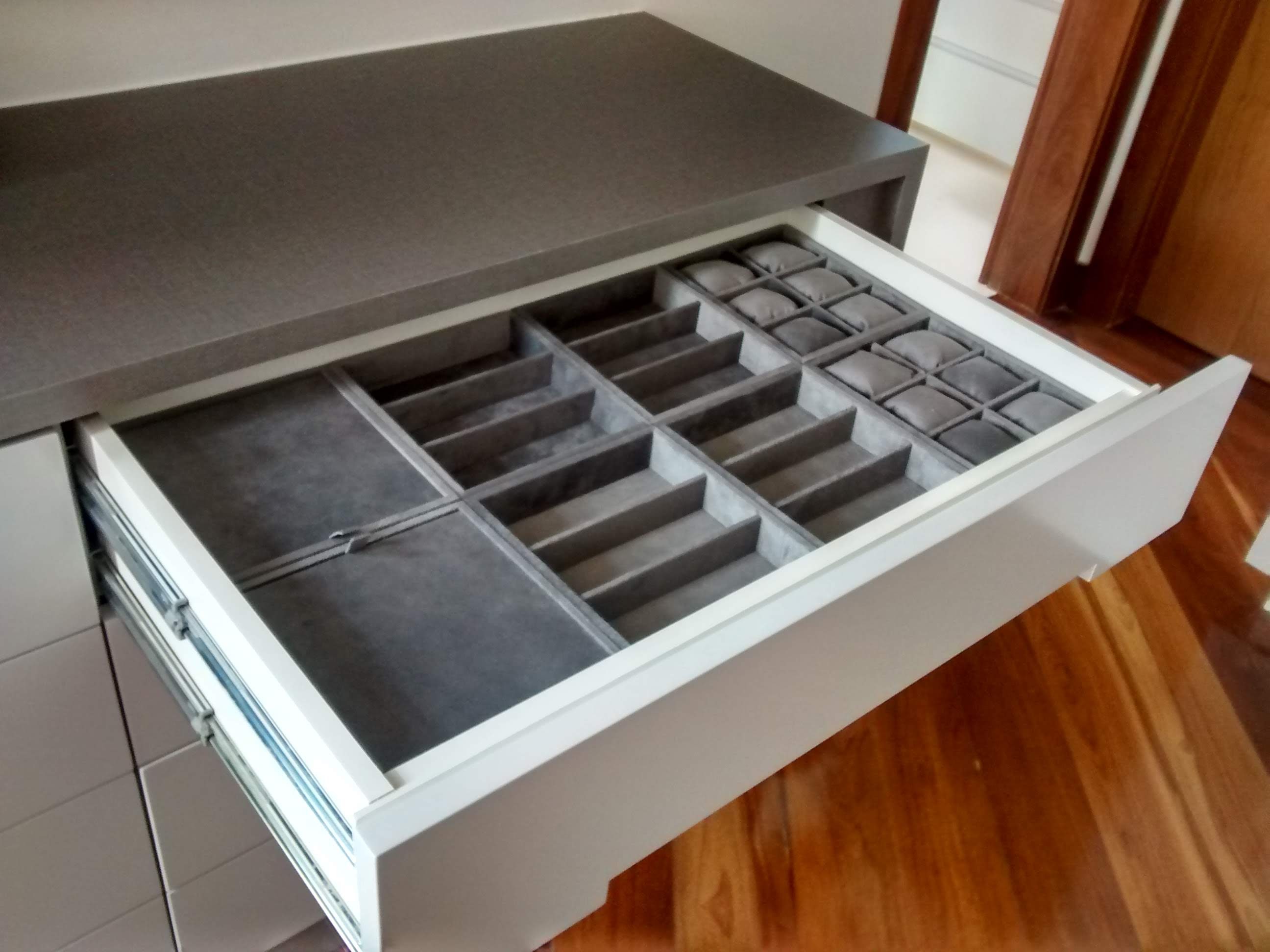 Fabricação de móveis exclusivos forrados em couro ecológico, cabeceiras de camas estofadas, organizadores de gavetas forrados, módulos para jóias.