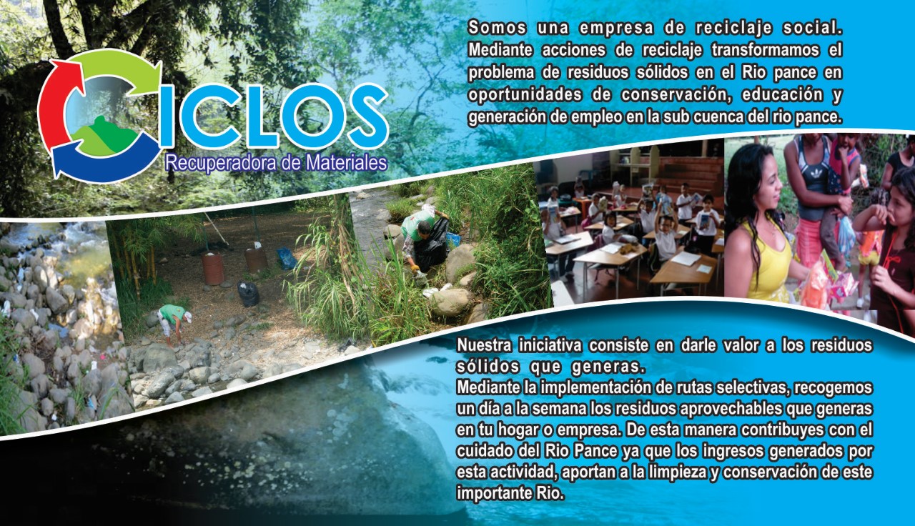 Recuperadora de materiales Ciclos, es una empresa de economía solidaria que trabaja por la inclusión de población vulnerable, recuperadores ambientales y jóvenes de la zona rural de Santiago de Cali, en la recuperación de materiales (reciclaje) , recuperación de fuentes hidricas y educación ambiental a colegios.