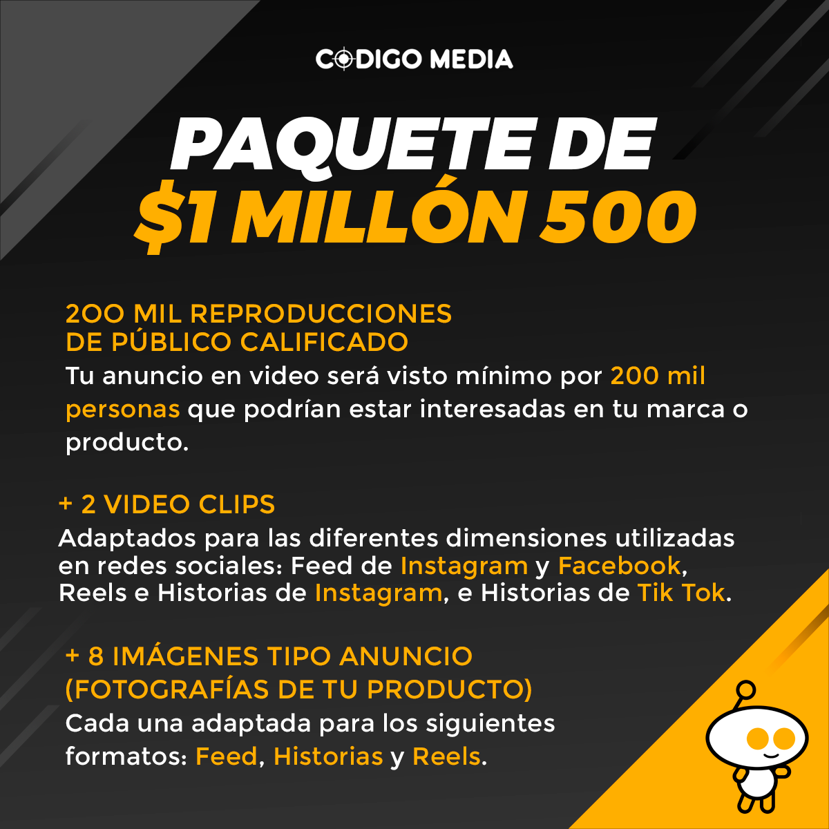 Te ayudamos a conectar con tu audiencia, a través de mensajes creativos y efectivos, al menor “COSTO POR ATENCIÓN”. Esta variable llevará tu marca a lograr sus objetivos comerciales, ya sea para impulsar la recordación de tus anuncios o influir en la decisión de compra de tu producto. La estrategia Código Media, se apoya sobre los 3 componentes más determinantes de una campaña de Marketing efectiva en redes sociales. Alcance: Número de personas que ven sus anuncios 1 vez Frecuencia: Número de veces que la misma persona ve sus anuncios (variable indispensable para crear recordación) Creatividad(CONTENIDO): Diseño y creación de historias en videos e imágenes (anuncios) Somos CODIGOMEDIA y Nuestra especialidad es “Negociar con la ATENCIÓN”. Sabemos donde Encontrarla, como Capturarla, Mantenerla y Dirigirla para ayudarte a conseguir tus objetivos como marca o negocio. Tenemos un objetivo: CREAR CONTENIDO QUE FUNCIONE. Hoy, esto puede significar muchas cosas, además de simplemente cumplir con los objetivos comerciales: ¿Funciona dentro del presupuesto? ¿Funcionará dentro de una línea de tiempo? ¿Funciona para cierto perfil de segmentación? ¿Es una “IDEA Contagiosa”? ¿Funcionará dentro del ecosistema de una plataforma? Nuestro equipo creativo y de producción está compuesto por: Especialistas en comercio electrónico, Escritores, Diseñadores, Artistas, Fotógrafos, Animadores, Directores y productores, El departamento de medios pagados consta de varias disciplinas, que incluyen: Planificación y Estrategia Compra e investigación de medios Tecnología de informes Analítica de datos Gestión de plataformas publicitarias Pago de publicidad. Al tener todas estas disciplinas bajo un mismo techo, somos capaces de integrar las consideraciones creativas y de los medios en todos los esfuerzos de planificación de la comunicación, para PRODUCIR CONTENIDO de alta calidad que se ajuste prácticamente a cualquier medio y tendencia emergente de importancia para una marca o producto.
