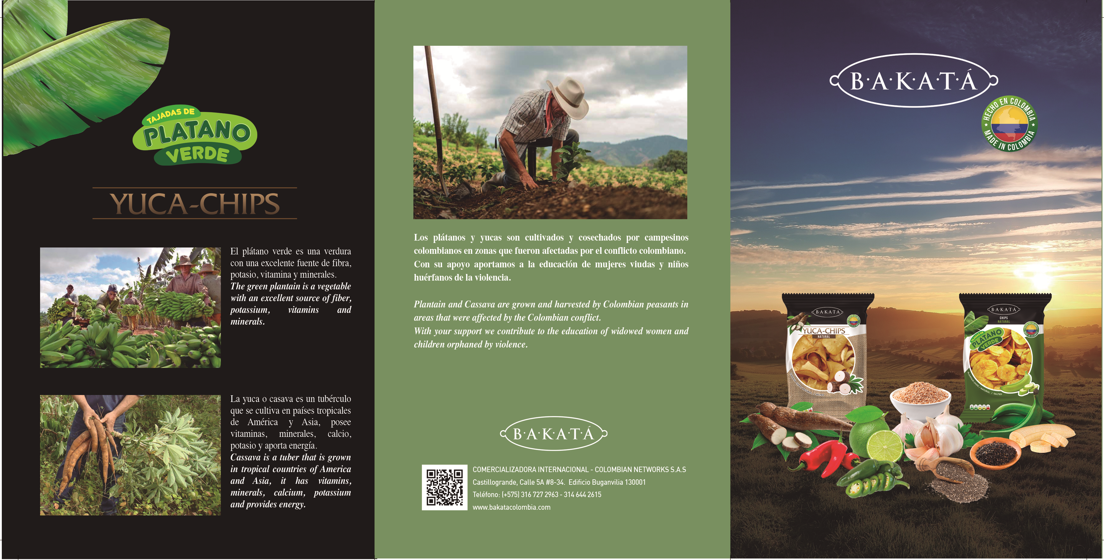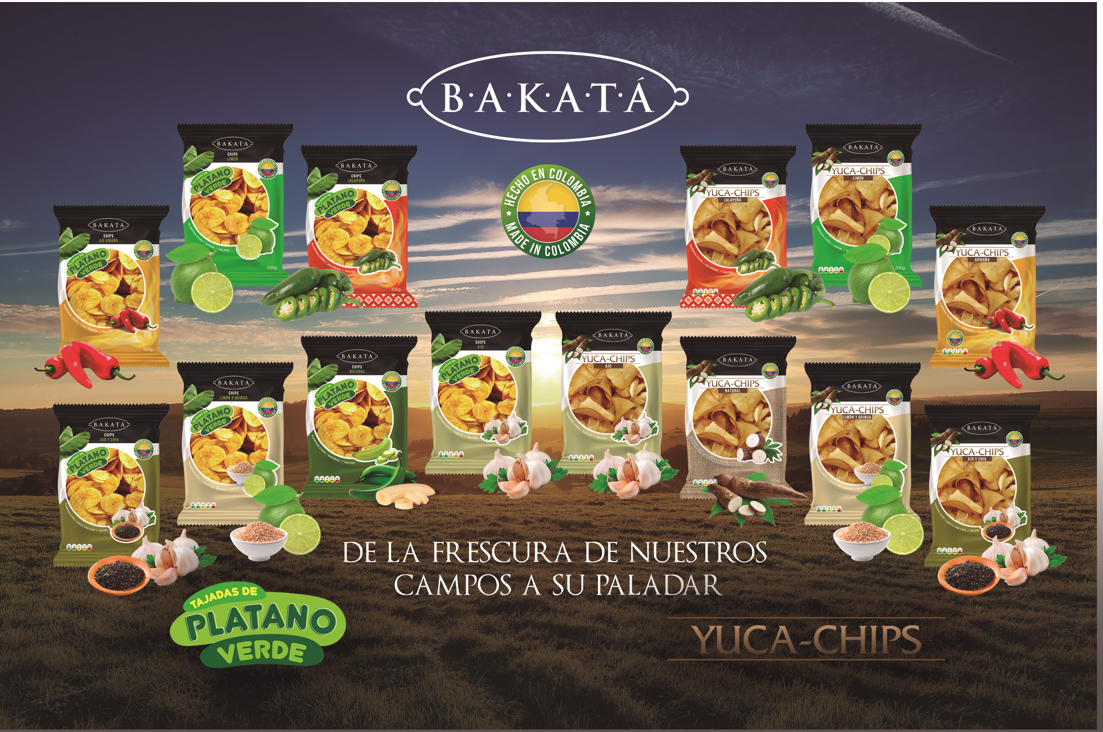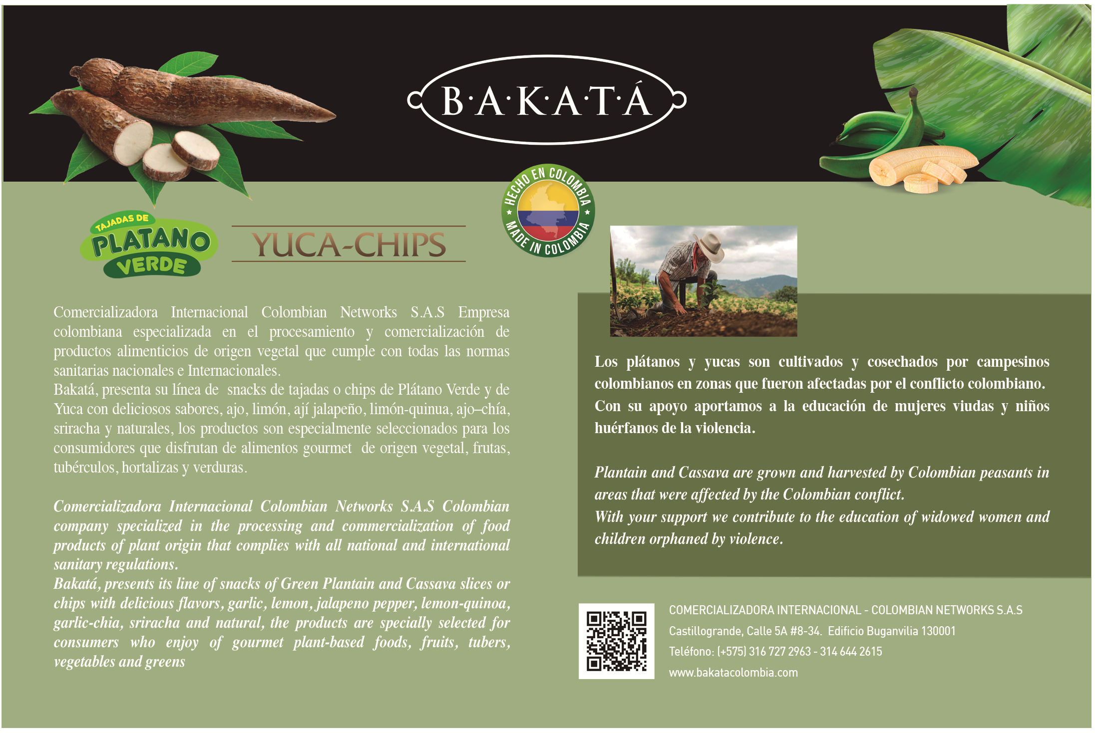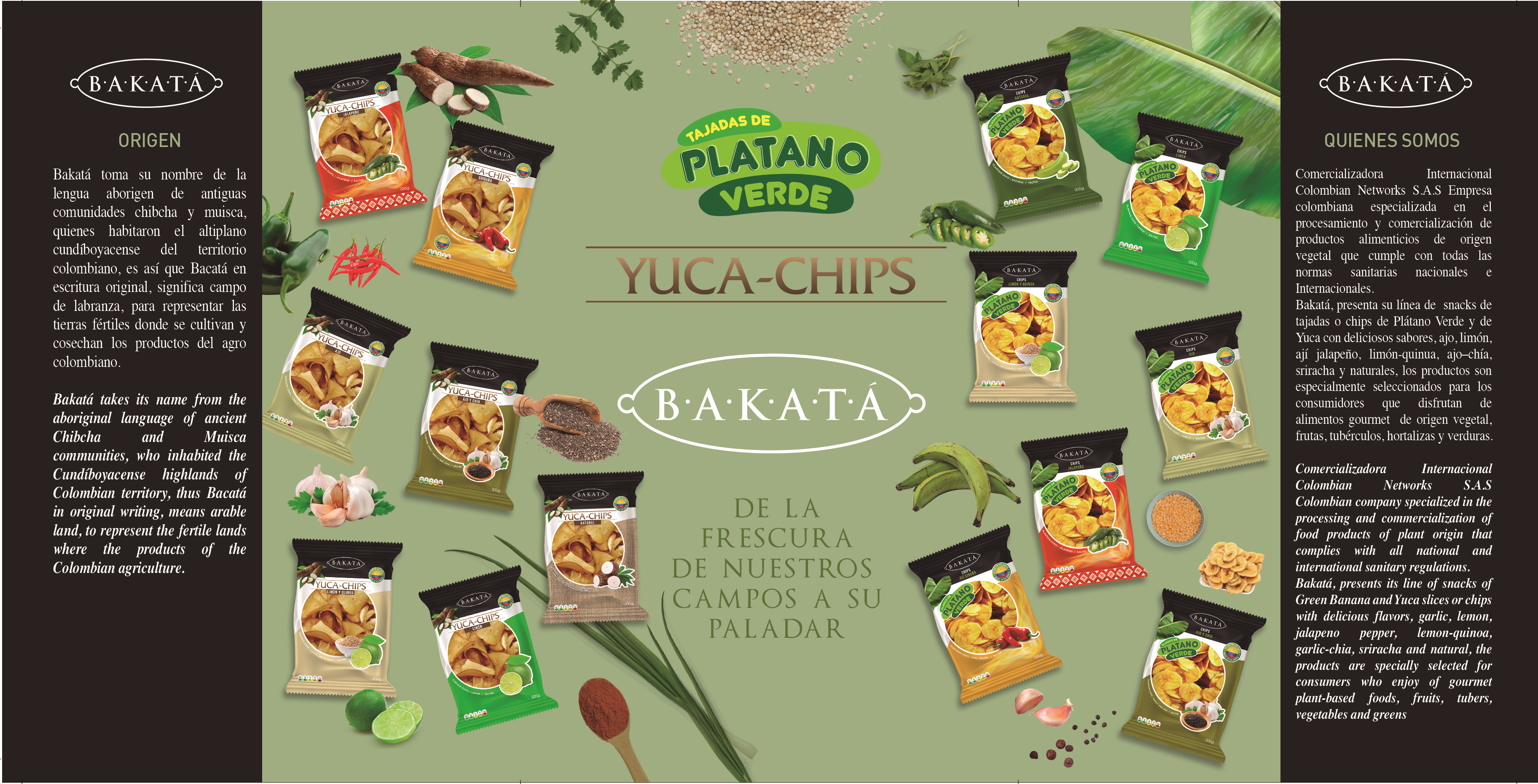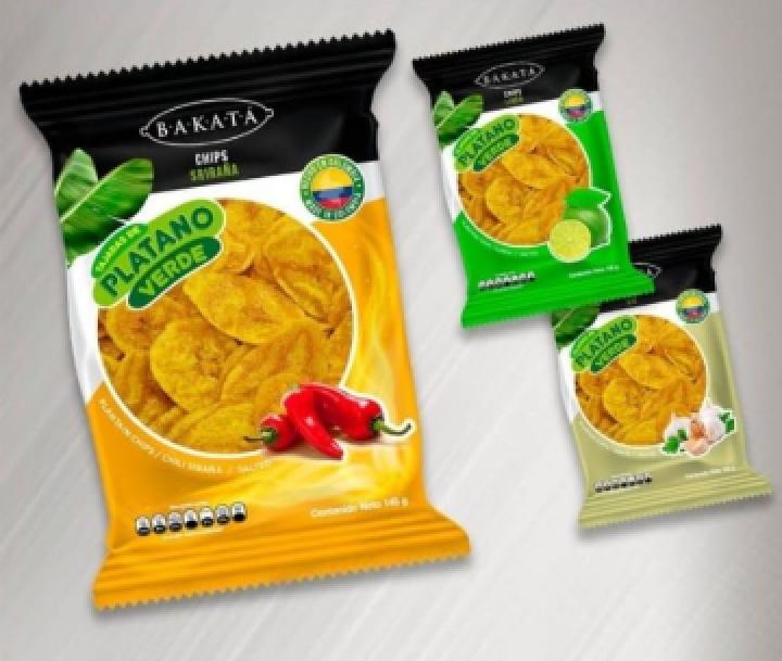 la empresa comercializadora colombiana internacional Networks sas es fabricante de snacks de plátano verde y yuca con 7 sabores a, natural, Limón-Quinua, Ajo-Chía, Jalapeño, Limón, siracha, ajo.