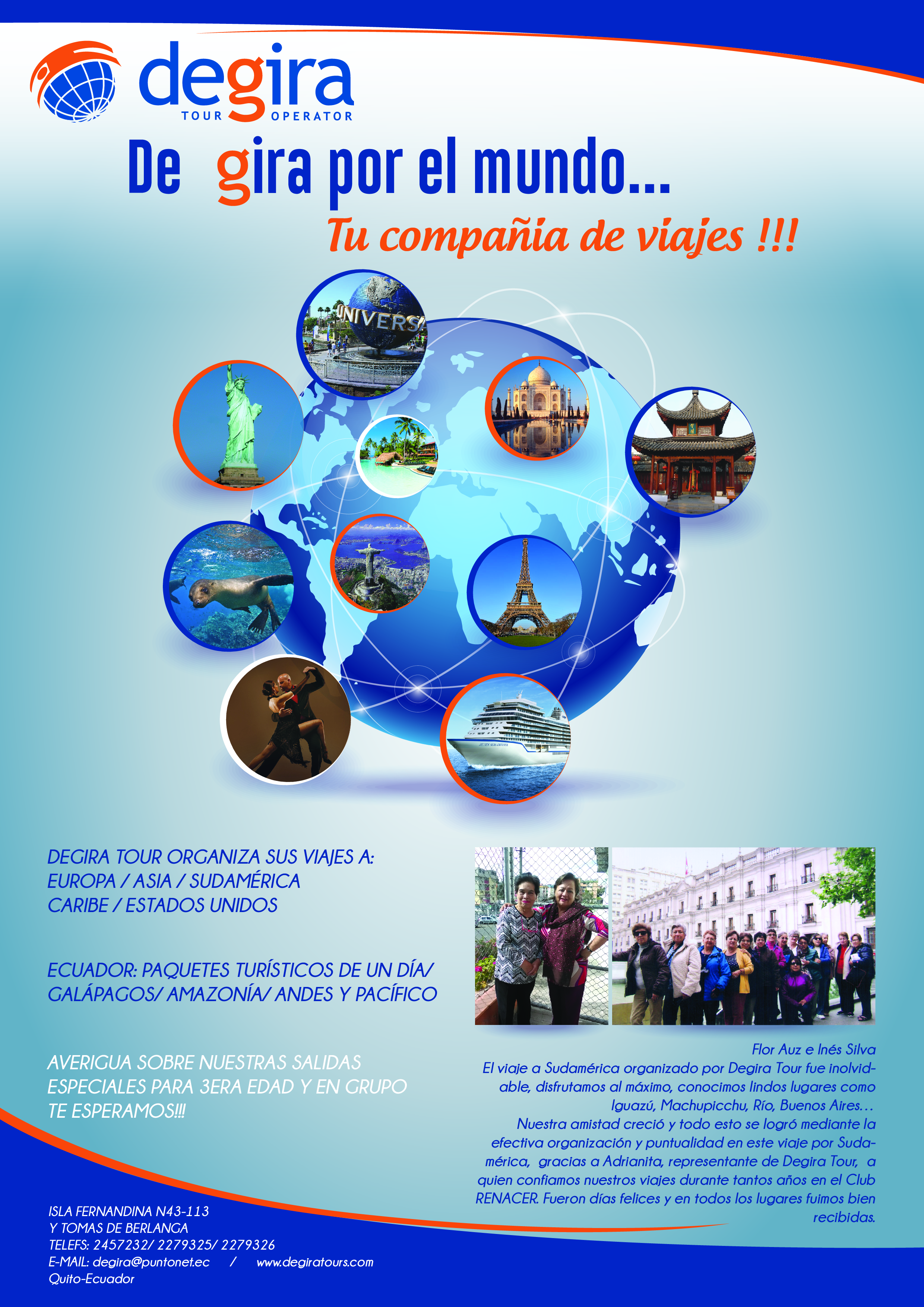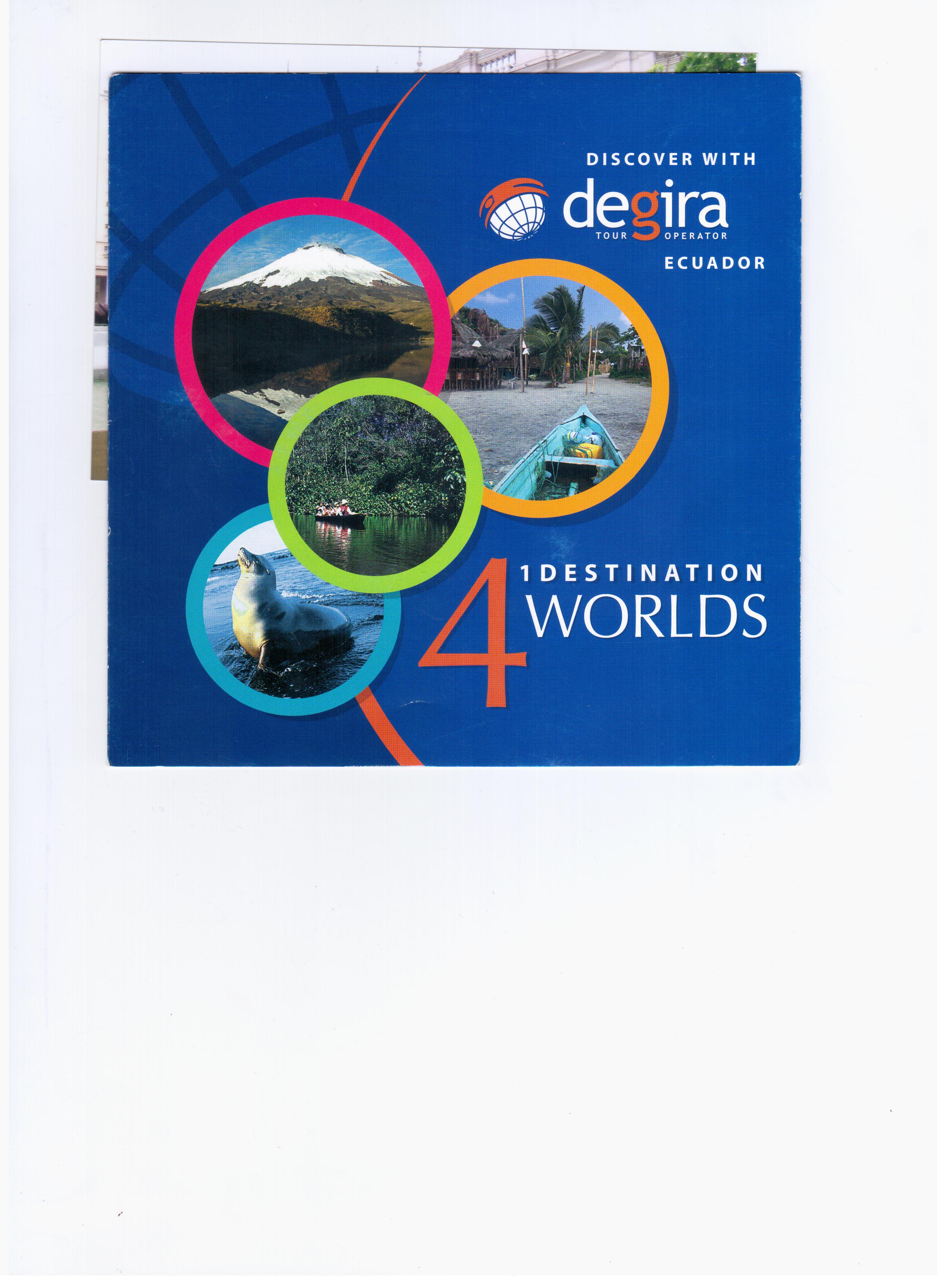 Agencia de Viajes: Venta de servicios turísticos dentro y fuera del Ecuador, organizamos eventos para Empresas, Organizamos viajes de extranjeros que vienen al país, organizamos viajes para el adulto mayor y todo tipo de turista al exterior. Vendemos seguros de viajes y además vendemos tkts aéreos a cualquier parte del mundo y del Ecuador. Tenemos contacto con Hoteles, restaurantes, trabajamos con guías profesionales y además contamos con nuestras Mayoristas con quien coordinamos nuestro trabajo para la entrega de servicios de hoteles, barcos restaurantes, circuitos a nivel mundial, alquiler de autos, garantizando nuestros servicios en cualquier parte del mundo.