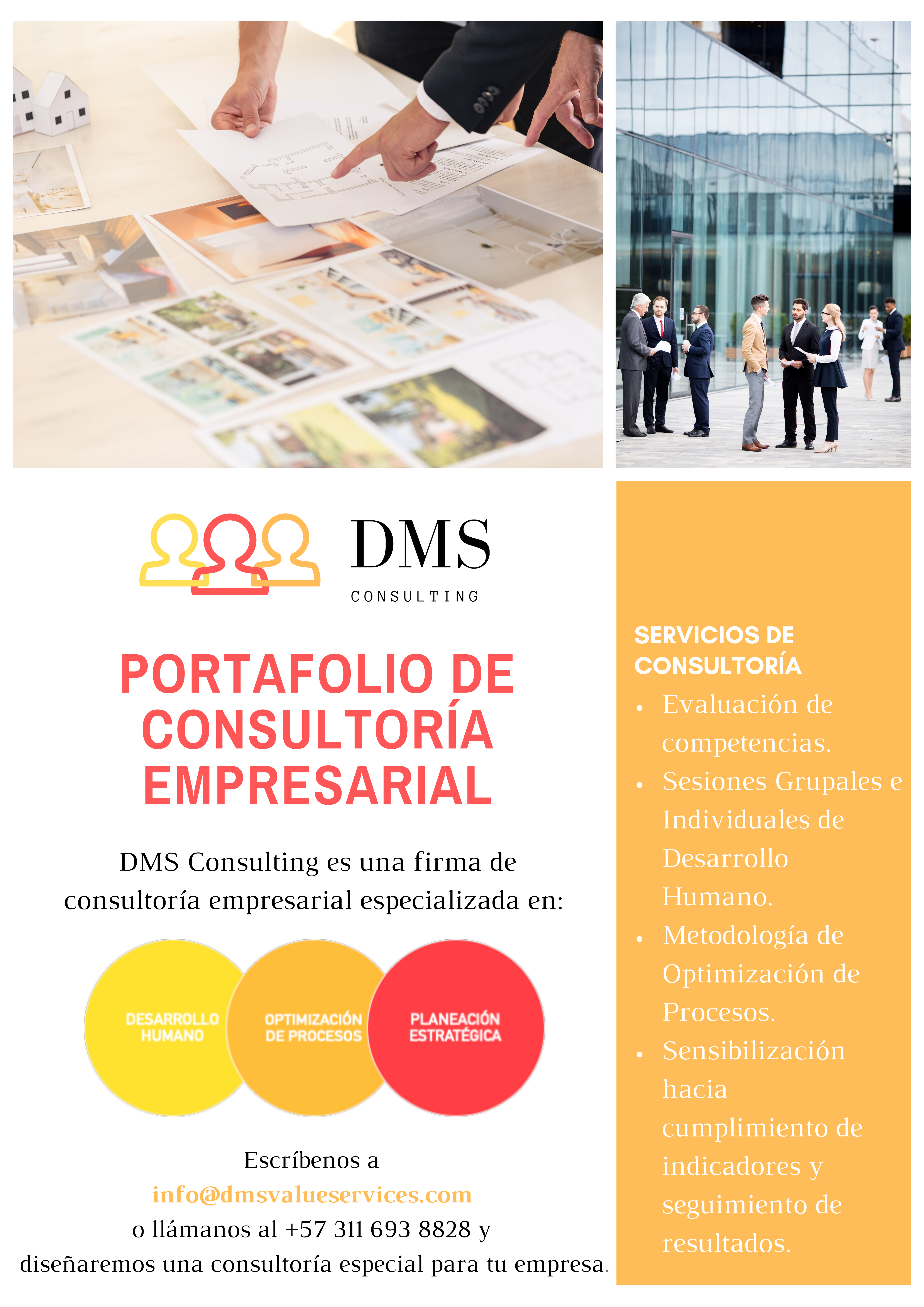 DMS Consulting es una firma de consultoría empresarial especializada en Desarrollo Humano, Optimización de Procesos y Planeación Estratégica. A partir del Desarrollo Humano logramos la adaptación al cambio requerida para la Optimización de Procesos y acompañamos a la empresa a ampliar su campo de acción a través de la Planeación Estratégica.