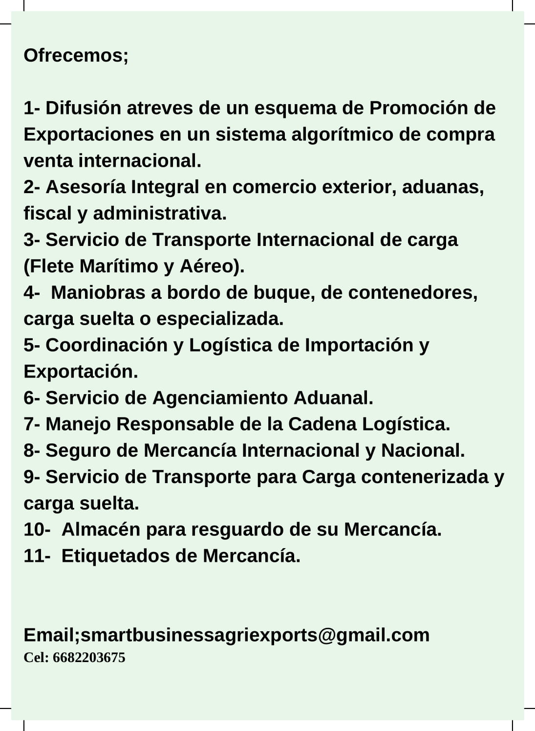 Agencia de Exportancion dedicada a; El servicio incluye lo siguiente; 1- Difusión atreves de un esquema de Promoción de Exportaciones en un sistema algorítmico de compra venta internacional. 2- Asesoría Integral en comercio exterior, aduanas, fiscal y administrativa. 3- Servicio de Transporte Internacional de carga (Flete Marítimo y Aéreo). 4- Maniobras a bordo de buque, de contenedores, carga suelta o especializada. 5- Coordinación y Logística de Importación y Exportación. 6- Servicio de Agenciamiento Aduanal. 7- Manejo Responsable de la Cadena Logística. 8- Seguro de Mercancía Internacional y Nacional. 9- Servicio de Transporte para Carga contenerizada y carga suelta. 10- Almacén para resguardo de su Mercancía. 11- Etiquetados de Mercancía.