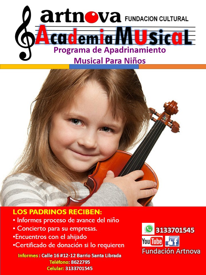 Brindamos formación musical para niños y jóvenes en condiciones de vulnerabilidad a través del programa apadrinase musical este programa busca empresas o personas naturales que quieran regalar a un niño la posibilidad de formarse en un instrumento musical especifico con su donación a este programa que a su vez el dónante se convertirá en mentor del proceso y ayudara a que el proyecto de vida de estos niños se fortalezca .Adicionalmente le ayudaremos a fortalecer su marca ya que esta contribuyendo al fomento de la cultura en nuestro país , con su responsabilidad social .