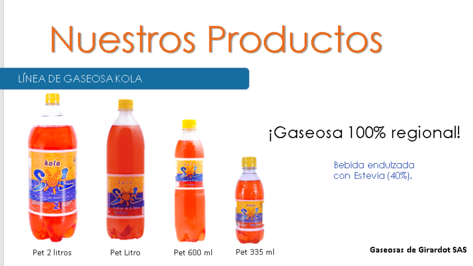 Somos productores y comercializadores directos de bebidas carbonatadas no alcohólicas, y establecidos en la ciudad de Girardot (Cundinamarca) con muchos años de experiencia en el mercado de las gaseosas.