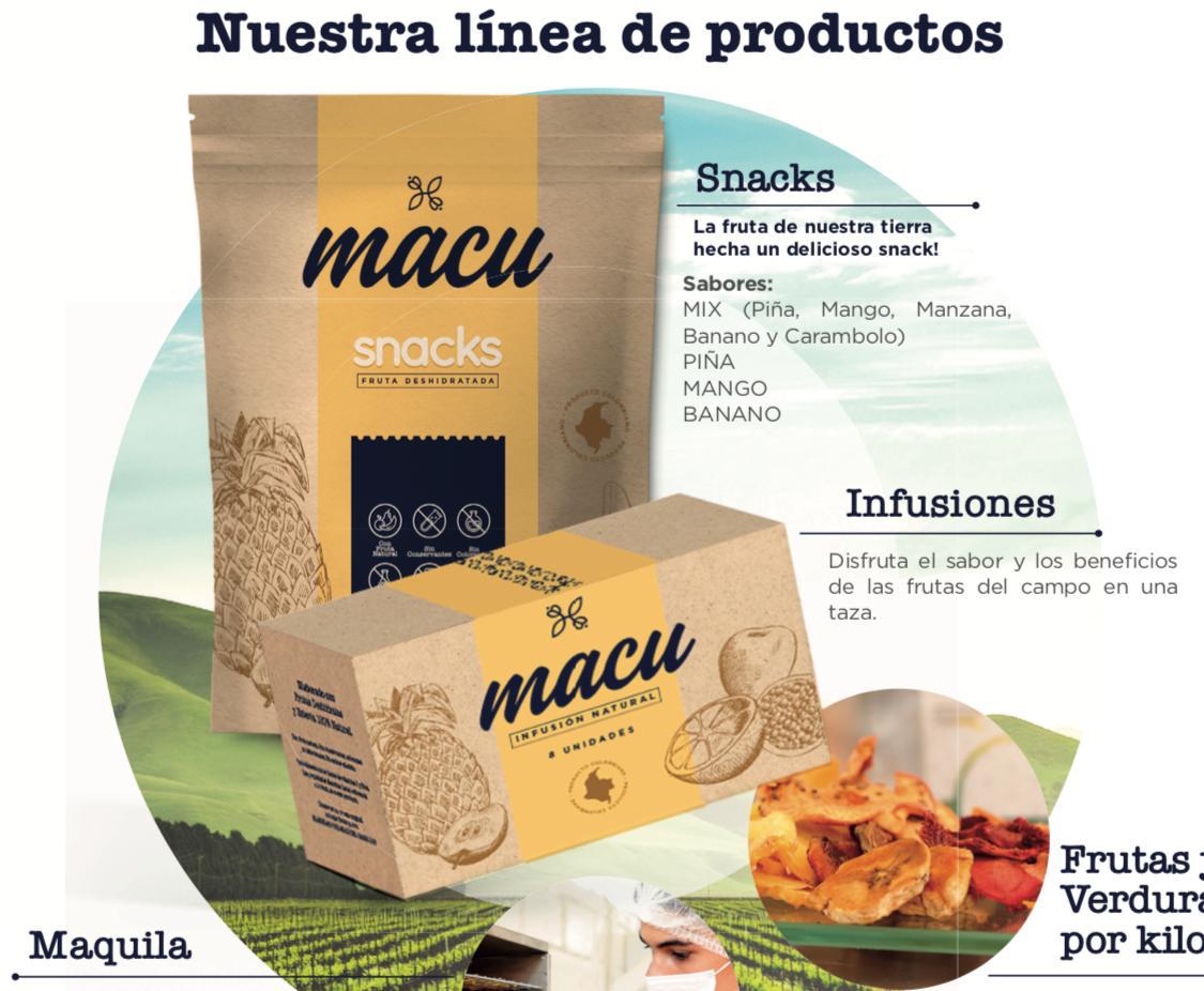 Produccion y comercializacion de frutas y verduras deshidratadas en diferentes presentaciones como: Snacks, Infusiones, bananas, pulverizados y venta granel