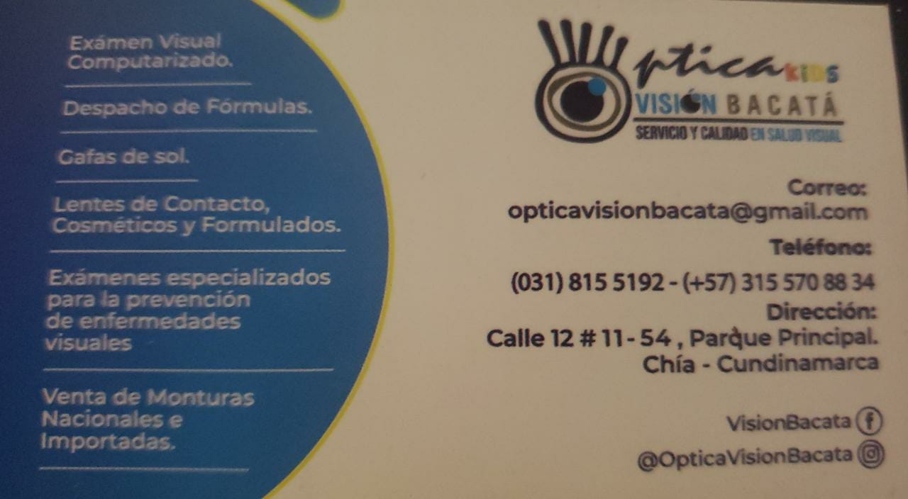 Somos una empresa dedicadas al cuidado de la salud visual de nuestros clientes. Contamos con la mejor tecnologia de punta, variados disenos en monturas nacionales e importadas, asi como lentes de sol, oftalmicos y lentes de contacto de acuerdo a la necesidad del paciente. Contamos con alianzas estrategicas en la region de sabana Norte, en Zipaquira, cajica, Chia y Bogota.