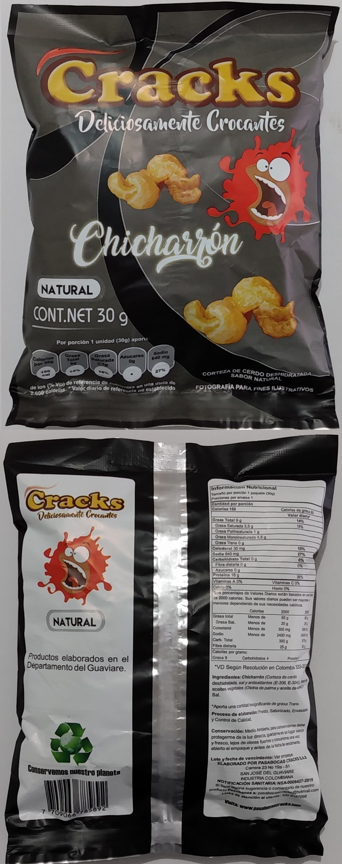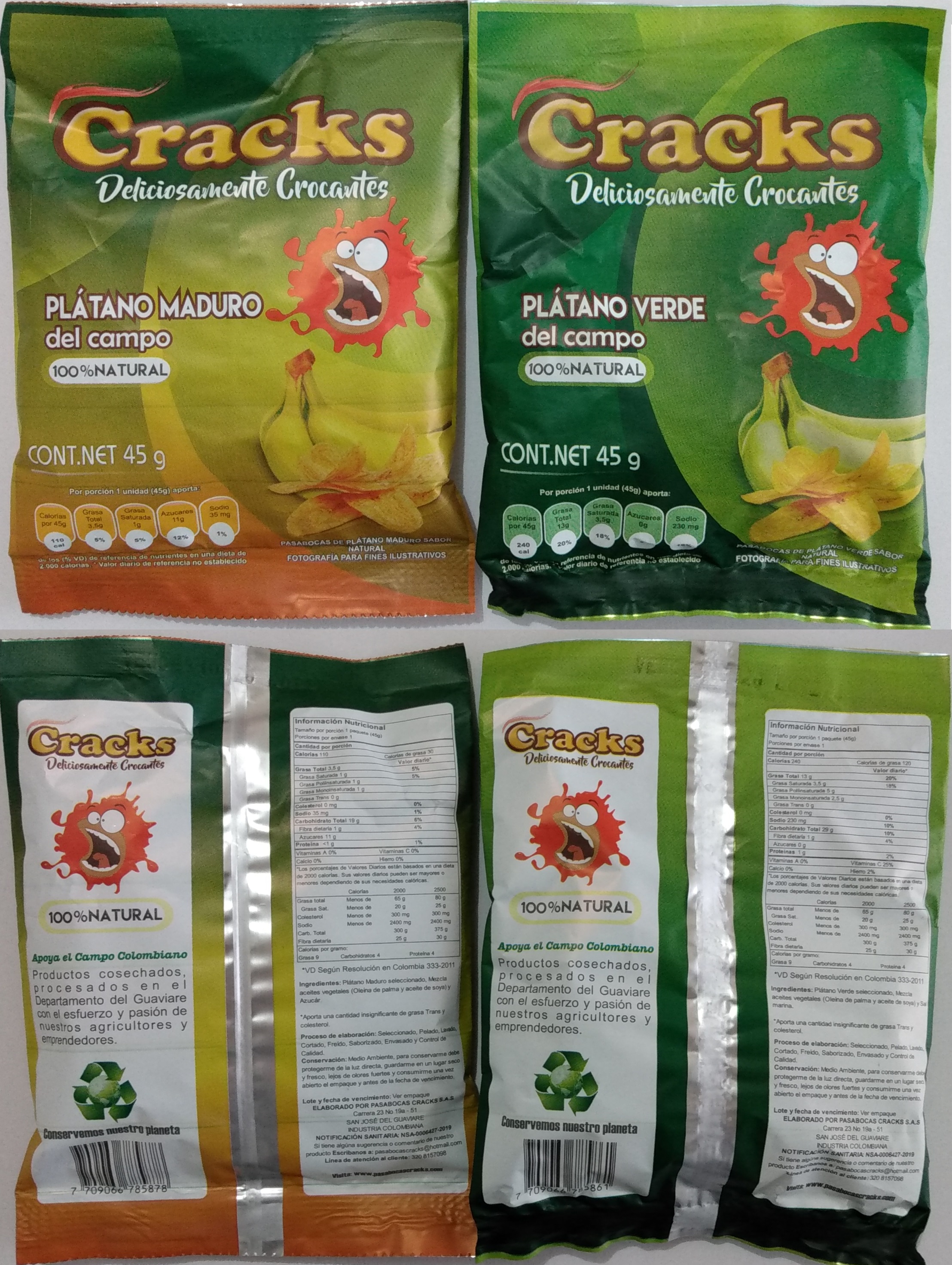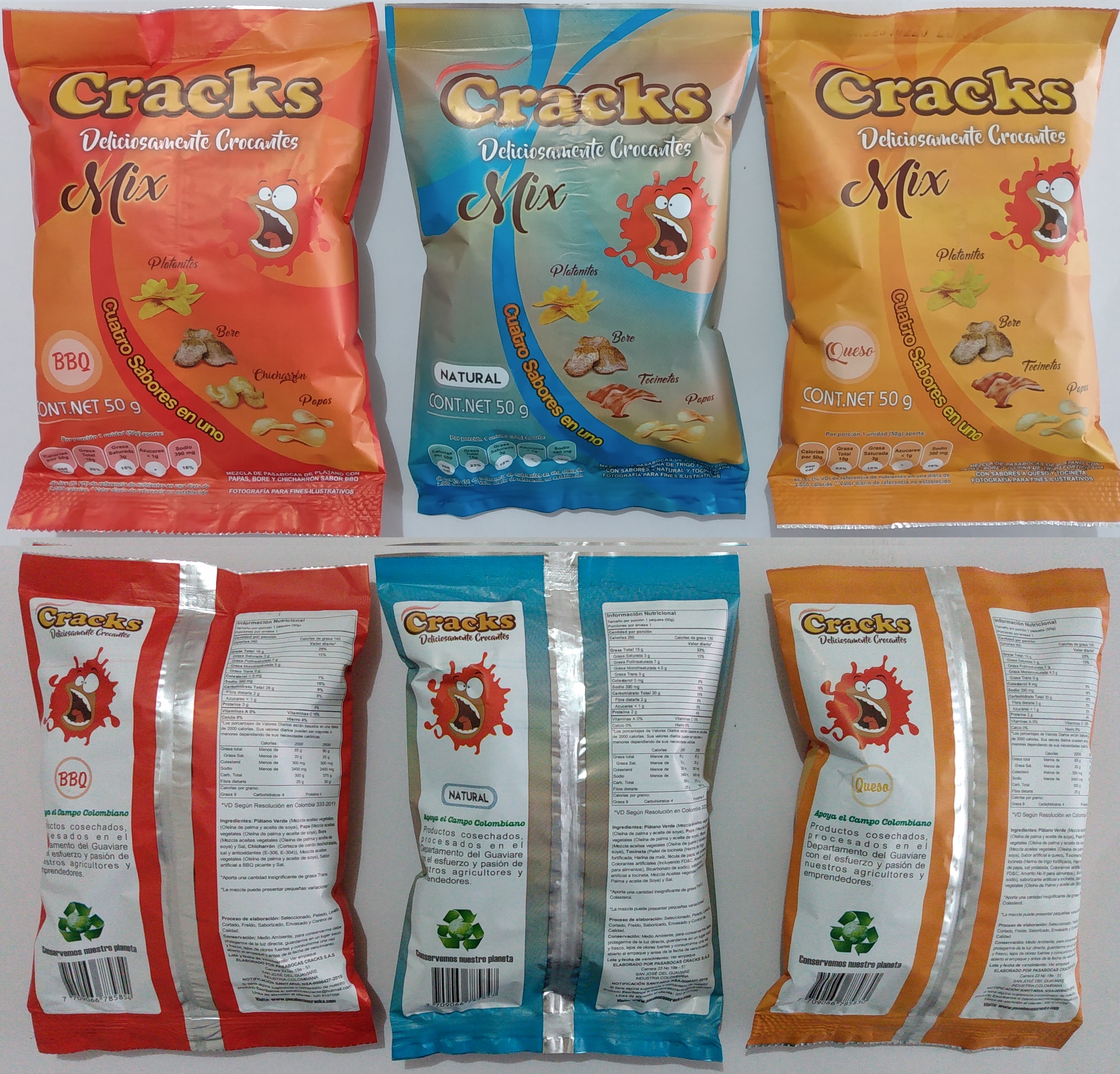 FABICACION DE SNACKS DE PLATANO VERDE Y MADURO X 45G X 12UNID, CRACKS MIX SABOR NATURAL, BBQ Y QUESO X 50G X 12UNID Y CRACKS CHICHARRON NATURAL Y PICANTE X 30G X 12UNID. PRODUCTOS ELABORADOS CON PLATANO HARTON Y BORE CULTIVADO EN EL DEPARTAMENTO DEL GUAVIARE, PAPA R12 CULTIVADA EN DE BOYACA Y CORTEZA DE CERDO DESHIDRATADA.