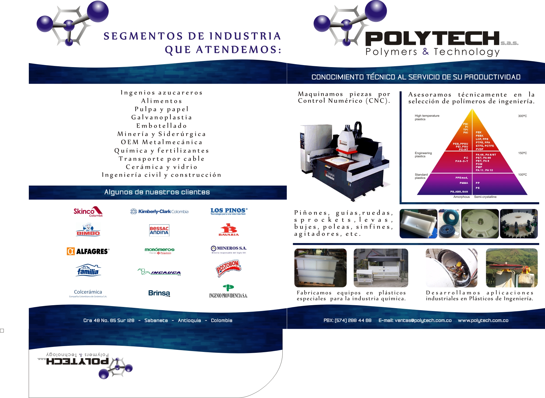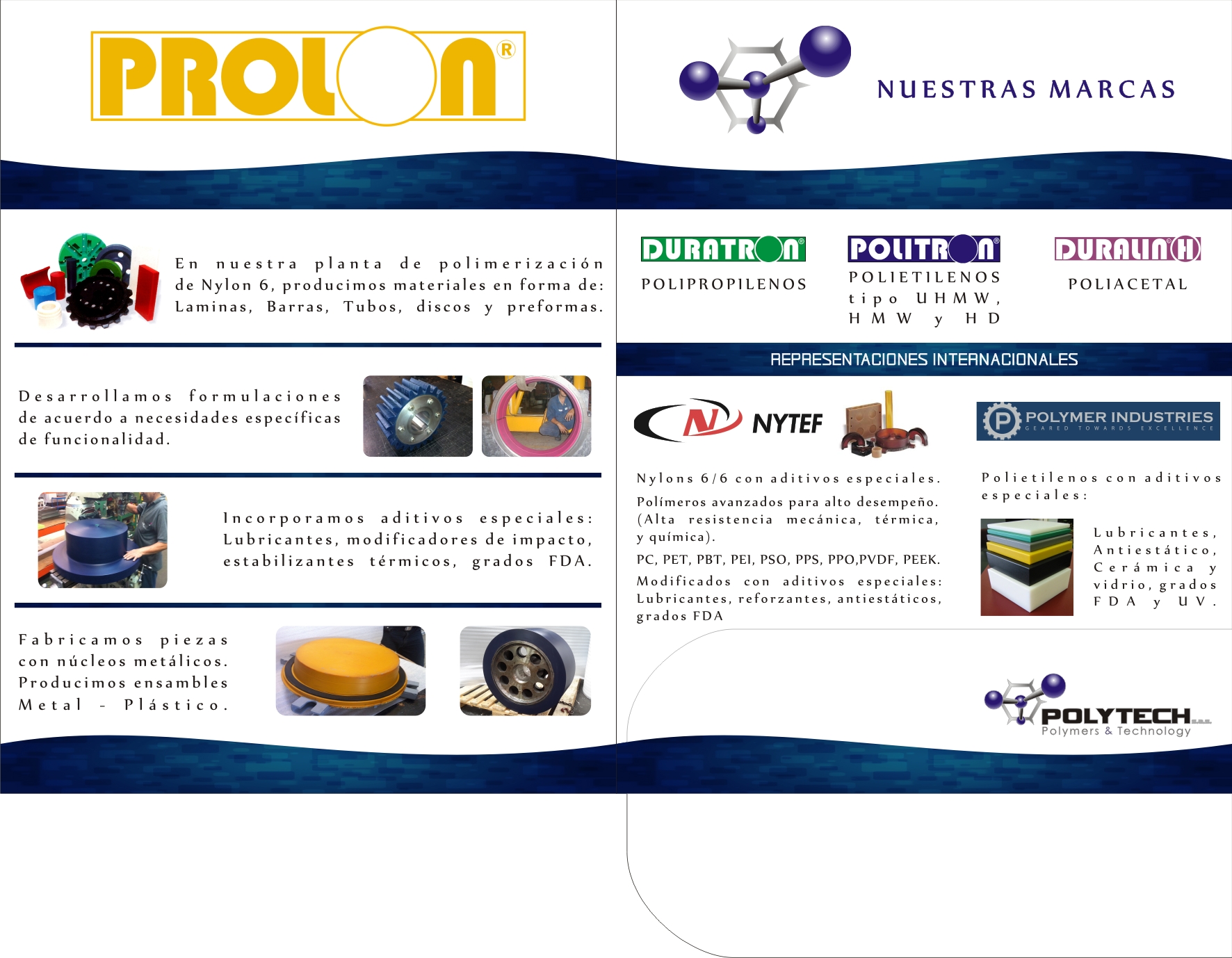 fabricación de partes y repuestos de maquinaria en plásticos de ingeniería tales como piñones, sprockets de cadena, guías de deslizamiento para cadenas, cangilones para elevadores de triturados minerales, poleas para grúas, bujes o cojinetes para trabajo pesado, rodillos cortadores de masa para industria de alimentos.Las piezas se fabrican a solicitud de los clientes según sus propios planos.