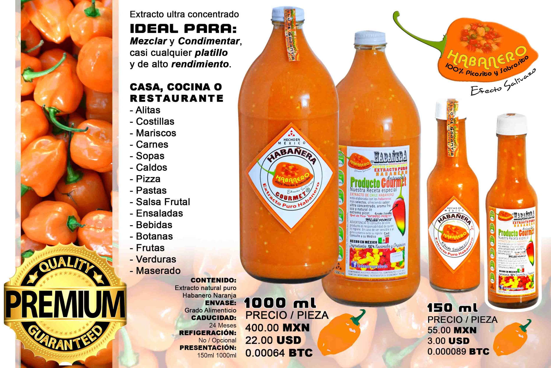 Somos un pequeño emprendimiento familiar en busca de expansión e inversión que desarrollo una línea de salsas y extractos desde el año 2015, teniendo como prioridad crear productos naturales y saludables. Emprendimos y Visionamos la gran riqueza del chile mexicano y pusimos manos a la obra para crear, procesar y envasar artesanalmente 7 variedades de salsa y extracto de los chiles más populares de México. Entregando actualmente a todos nuestros clientes y consumidores: - Innovación en salsas y extractos de elaboración Artesanal. - Variedad de productos (7 Recetas Originales y únicas) - Calidad Premium, Sabor, Aroma y Cuerpo en cada envase. - Ingredientes Naturales y saludables. - Envase 100% Reciclable y Utilizable. - Presentación Premium - Durabilidad en anaquel (Hasta 24 meses) - Sin uso de conservantes.