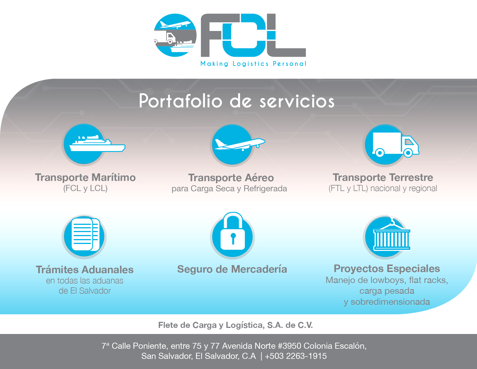 Flete de Carga y Logistica es una empresa joven manejada por profesionales de amplia trayectoria, nuestro recurso humano se ha desarrollado en el mercado logístico local y regional, estamos listos asesorar a los clientes y encontrar las mejores soluciones a sus requerimientos. Nuestro portafolio de servicios de importación y exportación consisten en: Carga Marítima completa y consolidada, carga aérea y vía Courier, transporte terrestre local y regional, servicios de trámite aduanal, proyectos especiales y bodegas. Nuestro trabajo principal es garantizar que siempre cumpla sus promesas, sin importar la distancia.