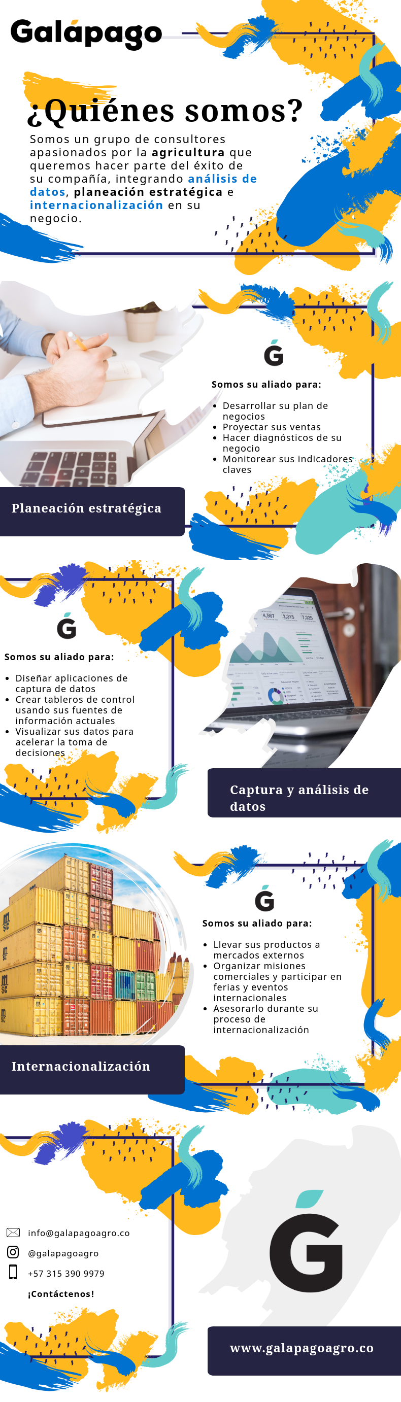 Somos un grupo de consultores apasionados por la agricultura que queremos hacer parte del éxito de su agronegocio, integrando análisis de datos, planeación estratégica e internacionalización en su empresa. Somos su aliado para los siguientes servicios. 1. Captura y análisis de datos: analizar grandes volúmenes de información (Big Data Analytics), crear tableros de control usando sus fuentes de información actuales, visualizar sus datos para acelerar la toma de decisiones, diseñar aplicaciones mobiles de captura de datos. 2. Planeación estratégica: desarrollar su plan de negocios, proyectar sus ventas, hacer diagnósticos de su negocio, monitorear sus indicadores claves. 3. Internacionalización: llevar sus productos a mercados externos, organizar misiones comerciales y participar en ferias y eventos internacionales, asesorarlo durante su proceso de internacionalización.