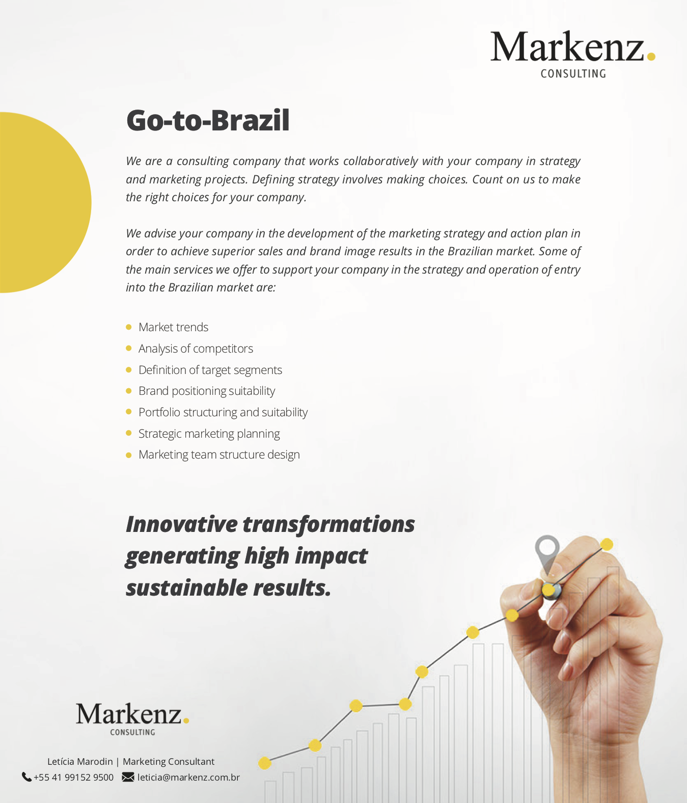We are a consulting company that works cooperatively with your company in strategy and marketing projects. We provide services ranging from development of marketing strategies focused on brand positioning, long-term growth and access to markets, to management of marketing operation programs and tactics to measure and optimize the efficiency and effectiveness of the budget and marketing programs. Please visit our website for further Information: www.markenz.com.br