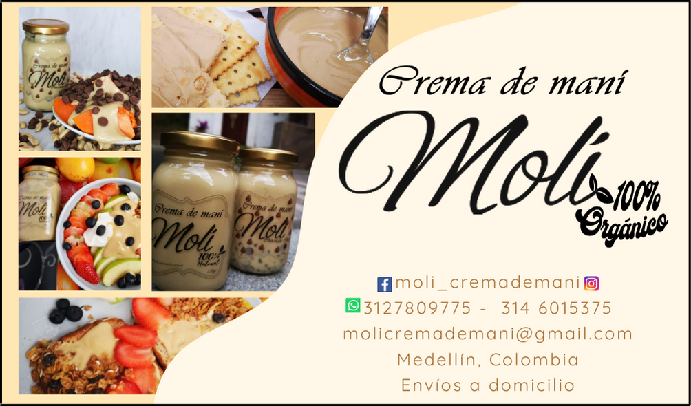 MOLI CREMA DE MANI es una crema de maní (comúnmente conocida como mantequilla de maní) 100% orgánica sin aceites añadidos, azúcares, sal, ni conservantes, que viene en tres presentaciones en frascos de vidrio las cuales son: 750 gramos, 250 gramos y 130 gramos. y en presentación de bolsa de 1,000 gramos. También manejamos una presentación de Mantequilla de maní con Chips de chocolate para aquellos que disfrutan de los sabores mas dulces