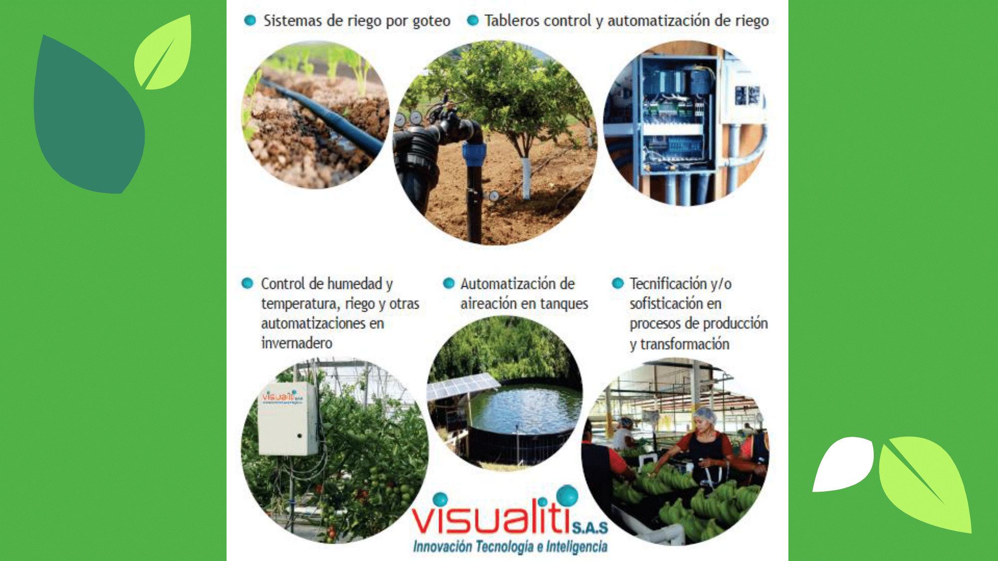 Impulsar el desarrollo de la agroindustria mundial, fundamentada en la investigación, desarrollo e implementación de soluciones tecnológicas integrales basadas en Internet de las cosas, ciencias de datos, telemática, mecatrónica, automatización, agricultura de precisión, agronomía, ing. agrícola, y otras ingenierías, aplicadas a la industria agrícola, para la optimización de recursos naturales, recursos materiales y procesos a lo largo de la cadena productiva, que además de impulsar el crecimiento de nuestros clientes, mejore el entorno socio ambiental del país y nos posicione como aliados estratégicos para la evolución hacia la agro industria 4.0